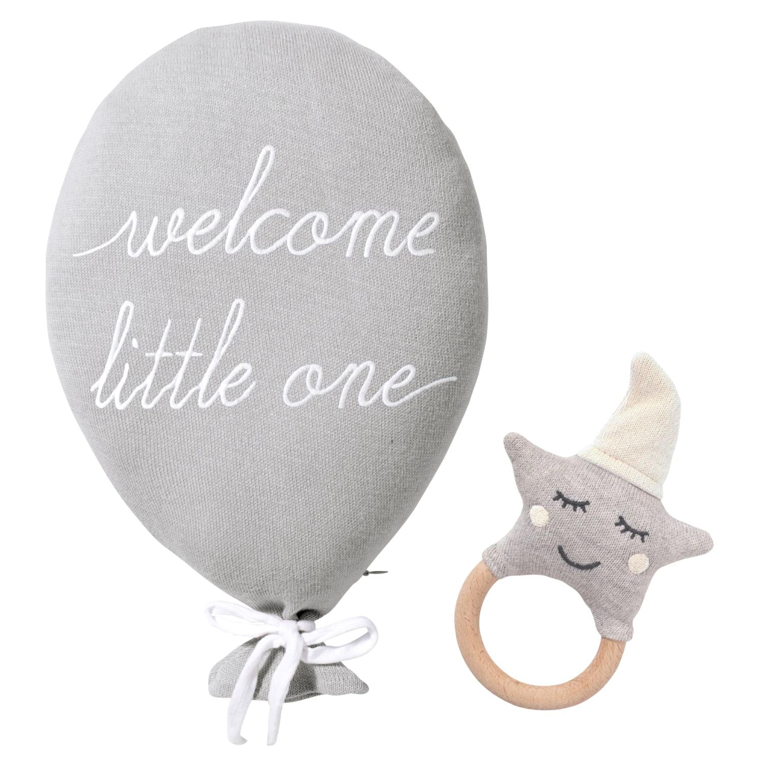 Das perfekte Willkommensgeschenk für die Kleinsten: Unser kuscheliges Dekokissen in Ballonform mit dem liebevollen Spruch „welcome little one" trifft auf eine praktische Rassel mit integriertem Beißring.