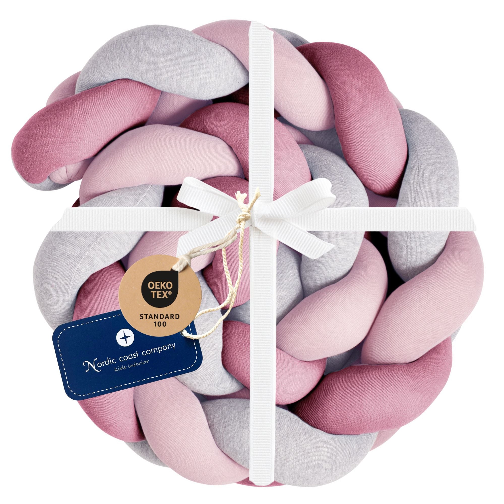 Übrigens: Unsere geflochtene Nestchenschlange ist das ideale Geschenk zur Taufe, Geburt oder Babyparty. Mit ihren drei Farben Beere, Rosa und Grau und dem niedlichen Zopfdesign wird sie zum absoluten Blickfang. Sie überzeugt mit Multifunktionalität und ihrem zeitlosen Jersey Look. Die Bettschlange ist in verschiedenen Farben erhältlich und kann somit in jedes Farbkonzept im Kinderzimmer integriert werden.