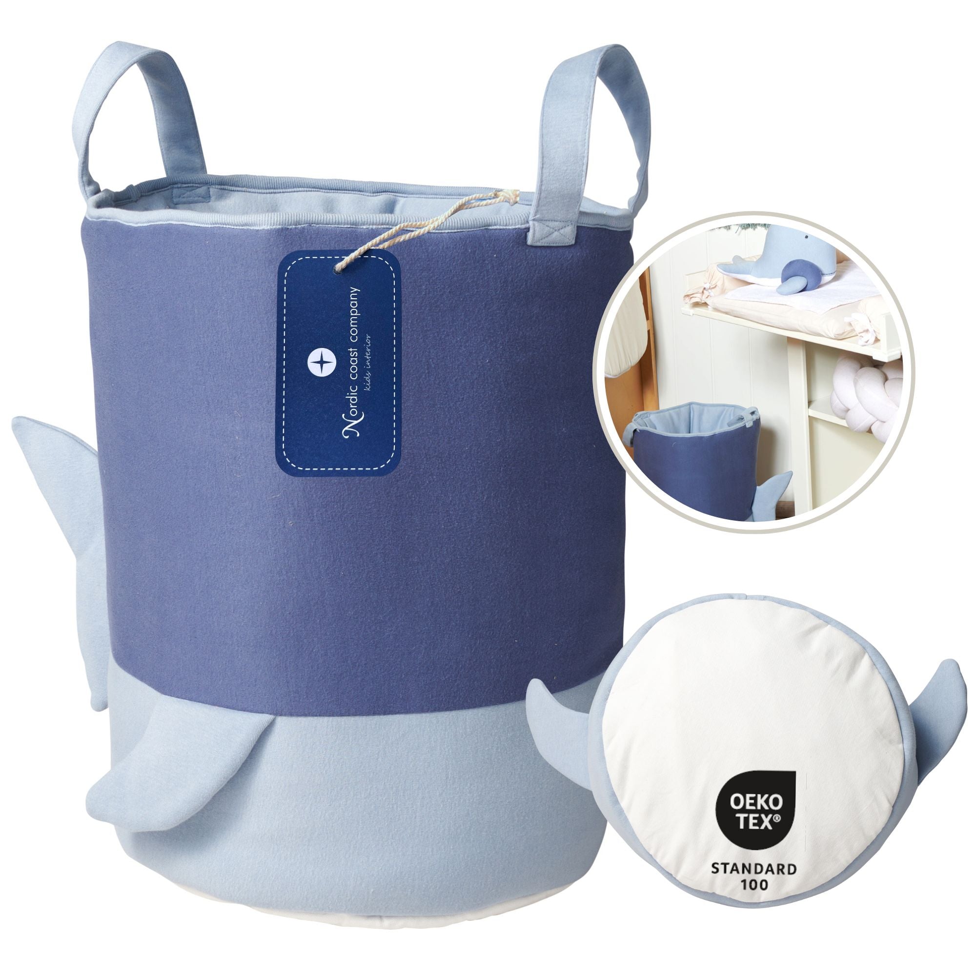 Die niedlichen Flossen und der weiche Stoff laden zudem zum taktilen Entdecken ein. Dank der Griffe lässt sich der Korb auch von kleinen Kindern schnell tragen.